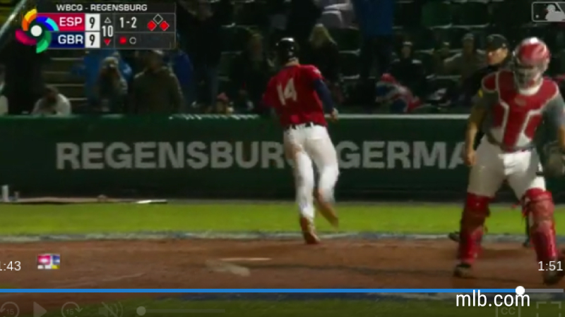 Hoosac Valley graduate Matt Koperniak scores the game-winning run in the bottom of the 10th for Great Britain in this screen capture from Major League Baseball's website. |