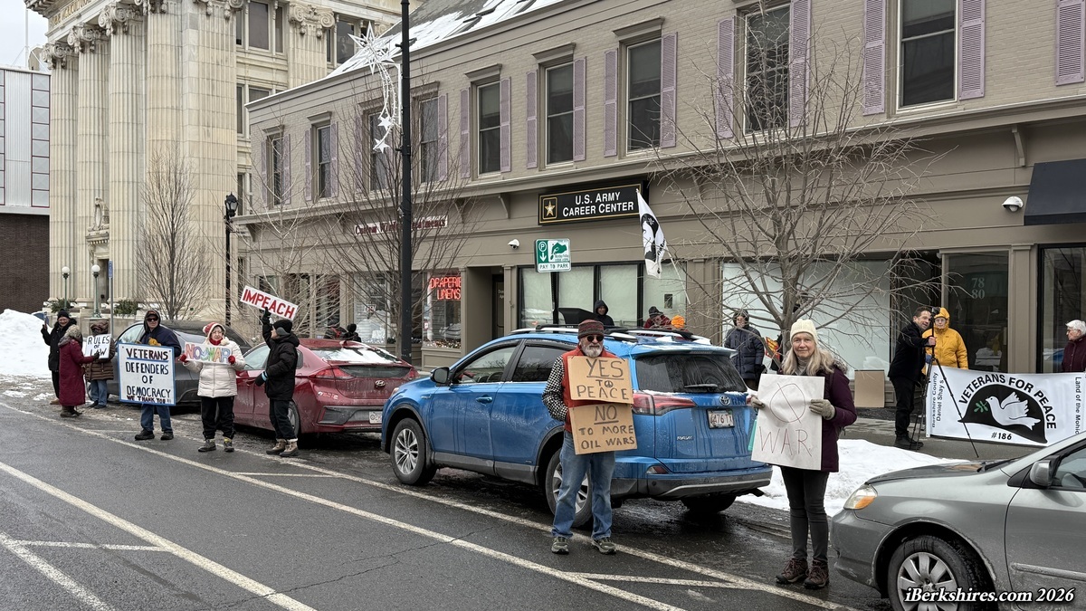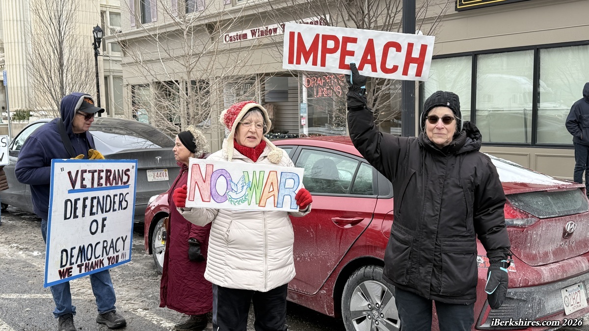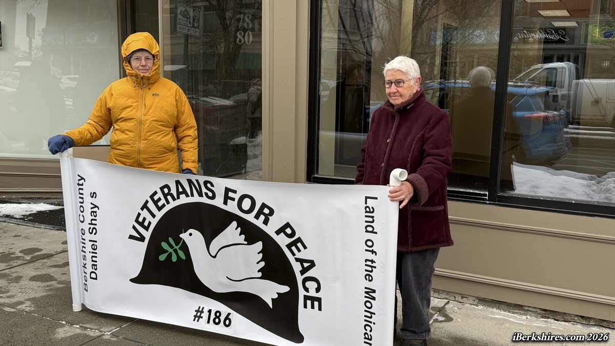 PITTSFIELD, Mass. — The new Berkshires chapter of Veterans for Peace held a stand-out Monday against the strike on Venezuela and the U.S. detention of its President Nicolás Maduro and his wife.